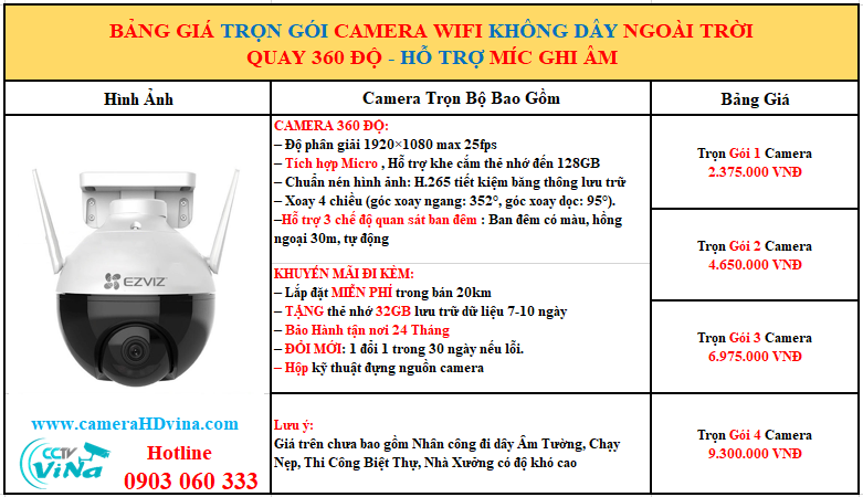 BÁO GIÁ TRỌN GÓI CAMERA WIFI NGOÀI TRỜI - GÓC QUAY 360 ĐỘ